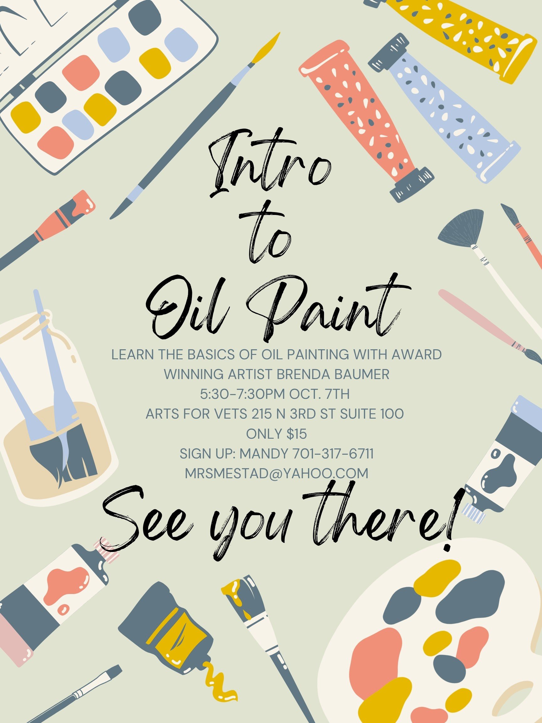 Intro to Oil Painting with Brenda Baumer Tuesday, October 7, 2025 5:30 PM 7:30 PM Arts for Vets 215 North 3rd Street, Suite 100 Grand Forks, ND, 58203 United States (map) Google Calendar ICS Learn the basics of oil painting with award winning artist Brenda Baumer! Only $15 to register! Contact (701) 317-6711 or email mrsmestad@yahoo.com to sign up!