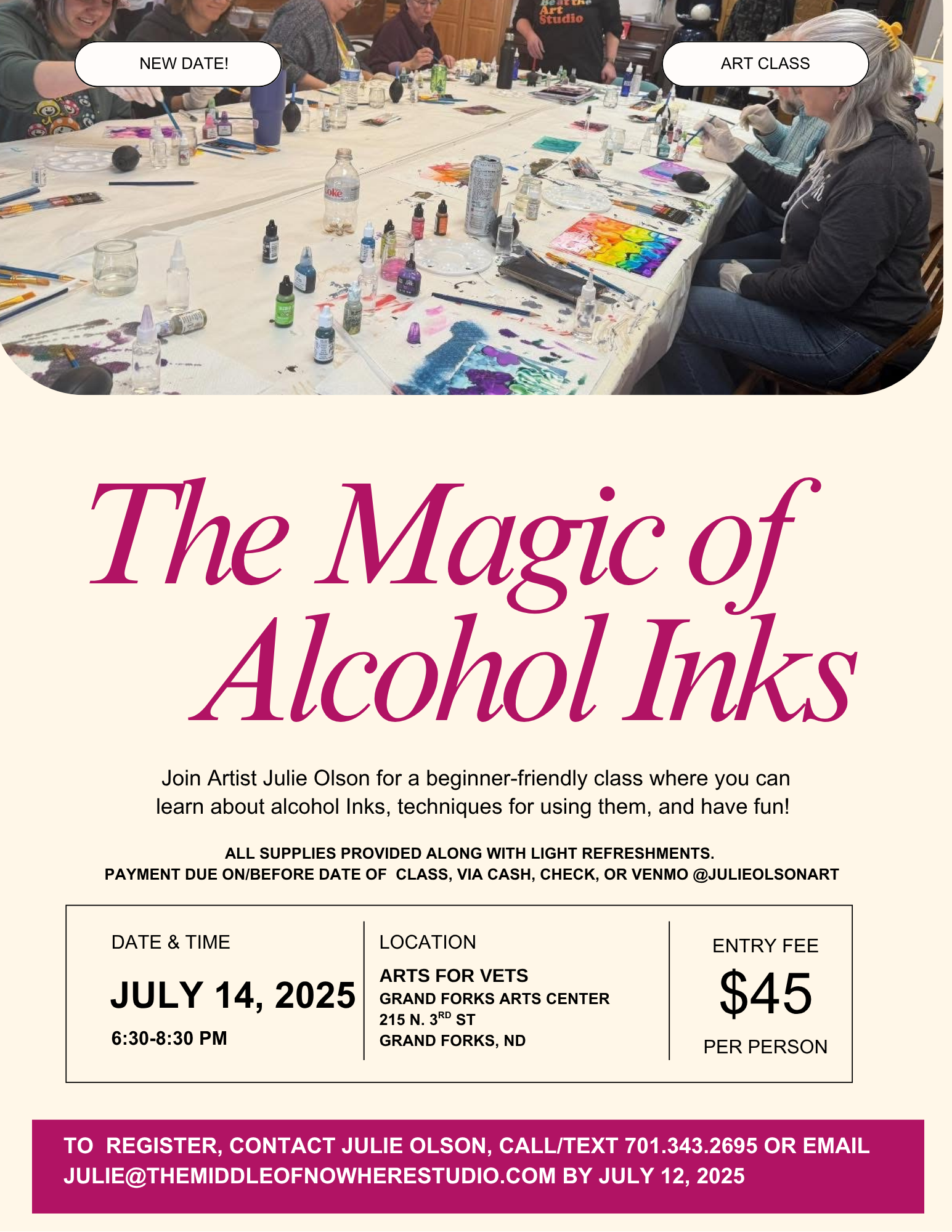 Back to All Events The Magic of Alcohol Inks Monday, July 14, 2025 6:30 PM 8:30 PM Arts for Vets 215 North 3rd Street Grand Forks, ND, 58203 United States (map) Google Calendar ICS Join artist Julie Olson for her upcoming class "The Magic of Alcohol Inks." Whether you're a beginner or seasoned artist, you'll be taught various techniques to create your own masterpiece! All supplies included. $45/person. Location: Arts for Vets 215 N 3rd St, Contact Julie to sign up julie@themiddleofnowherestudio.com or 701-343-2695